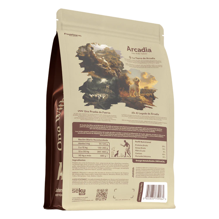 Formulado para cubrir las necesidades nutricionales de perros adultos. Su base de proteína deshidratada de alta biodisponibilidad aporta aminoácidos esenciales para el mantenimiento muscular y la vitalidad diaria. Enriquecido con aceite de oliva, fuente de ácido oleico y antioxidantes que contribuyen a la salud articular, dérmica y cardiovascular. Su fórmula baja en cereales (low grain) favorece una digestión eficiente y una microbiota equilibrada. Elaborado con ingredientes de alta digestibilidad y sin alérgenos comunes, Arcadia proporciona una nutrición completa para perros adultos.