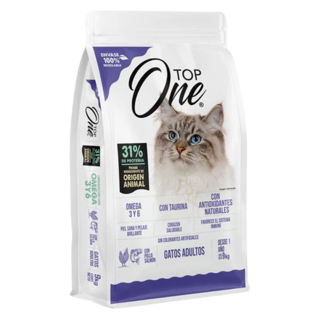 Alimento para gatos adultos con pollo y salmón, rico en proteínas y taurina para un corazón saludable, piel brillante y un sistema inmunológico fuerte.